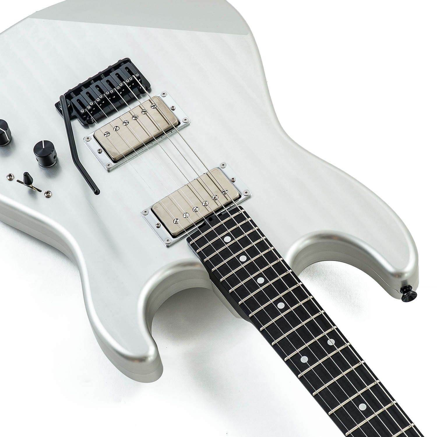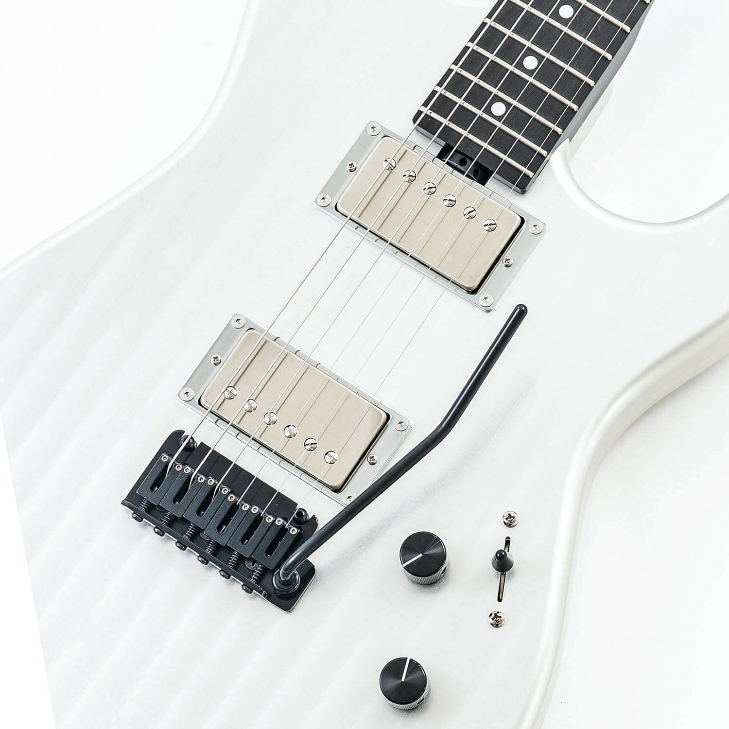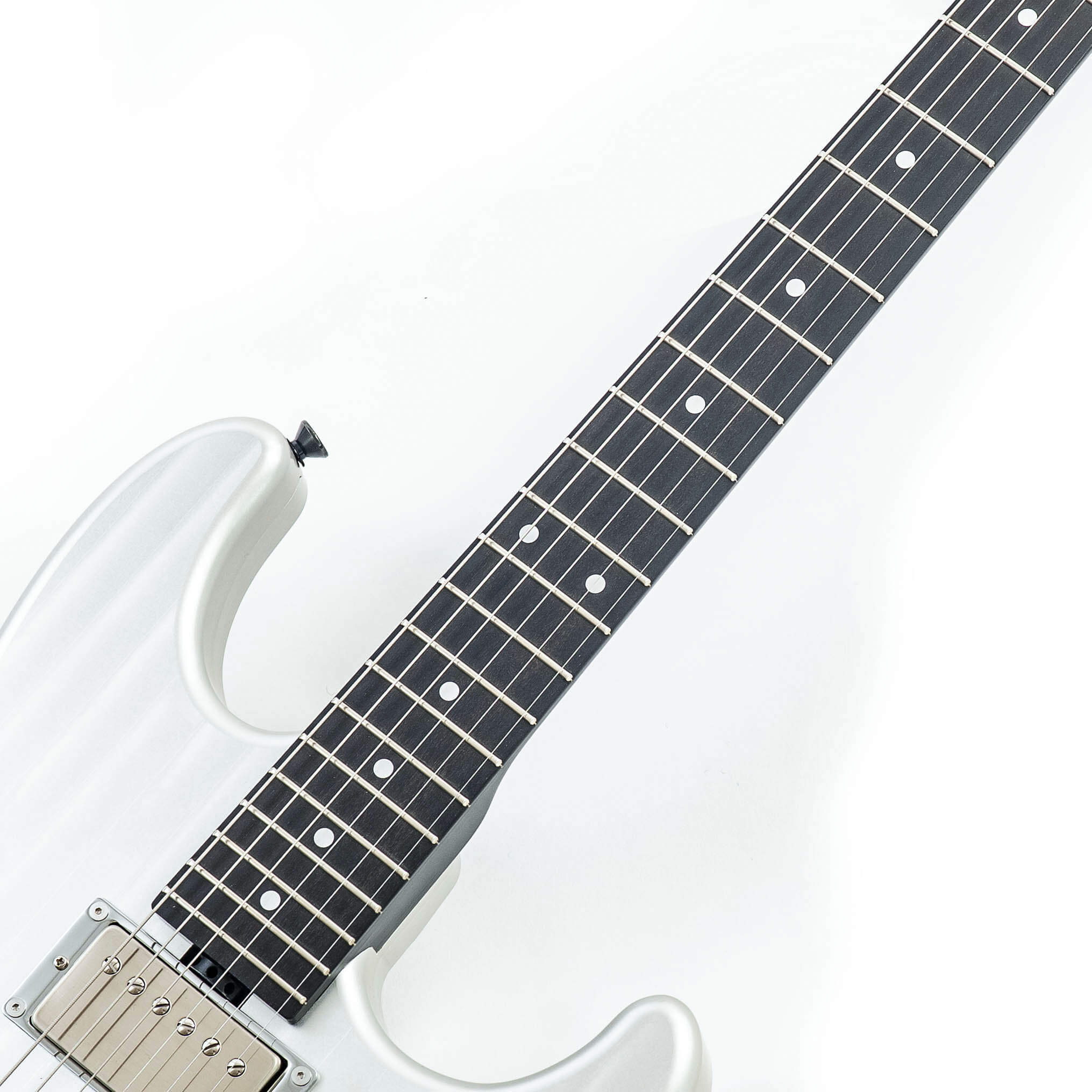 「Alumìnio-G」は、アルミニウムボディを採用したSTスタイルです。アルミニウム削り出しボディを採用し、内側をくり抜いた2つのボディ材をボルトで固定することで、軽量化と剛性を両立しました。美しい仕上げはもちろん、バックプレートやネックジョイントの継ぎ目の滑らかさからも、高い技術力を感じていただけます。さらに、ポジションマークにもアルミニウムを使用し、統一感のある洗練されたルックスを実現。ピックアップは、このモデルのために特別に設計されたカスタムメイド仕様。楽器のポテンシャルを最大限に引き出し、幅広いジャンルに対応するサウンドを提供します。