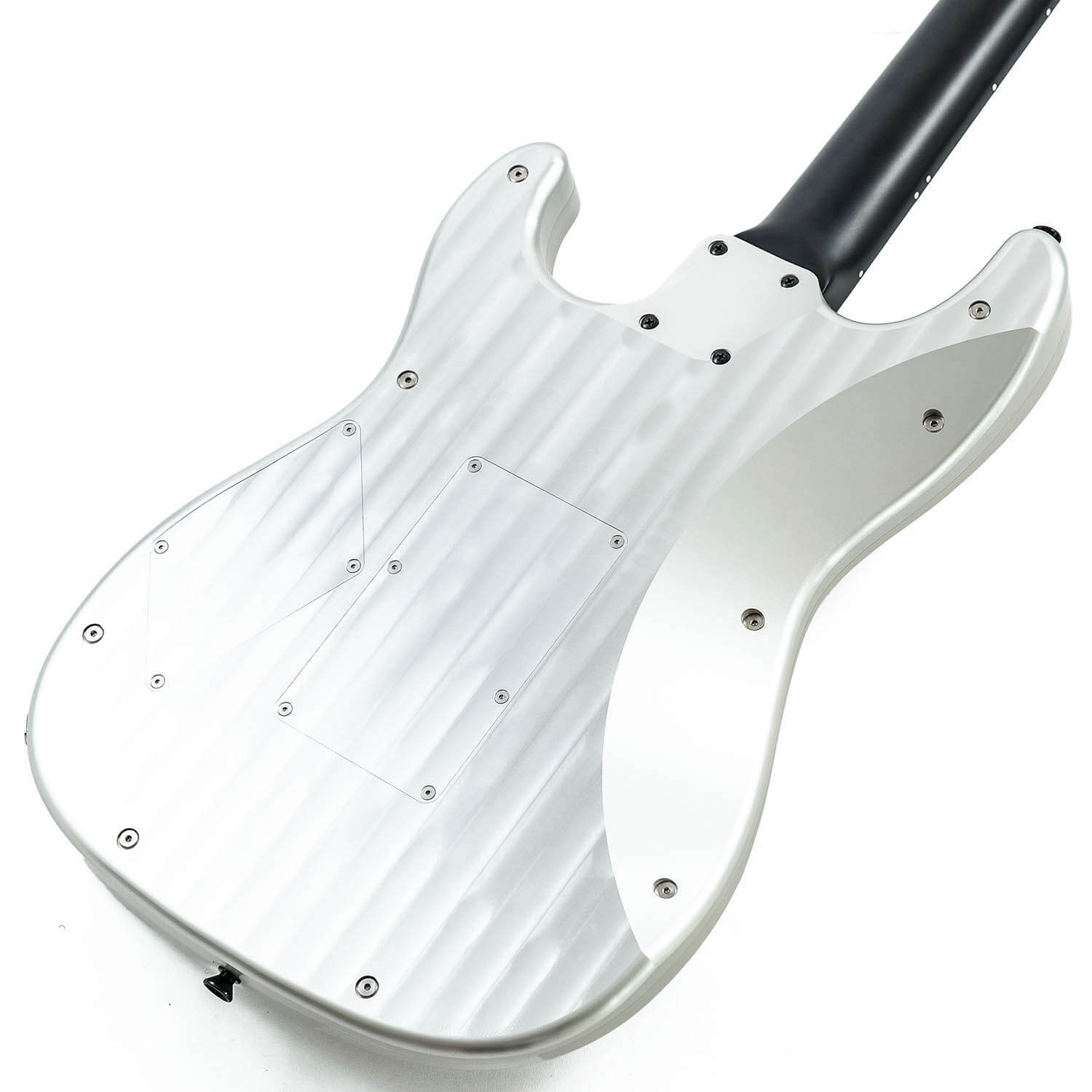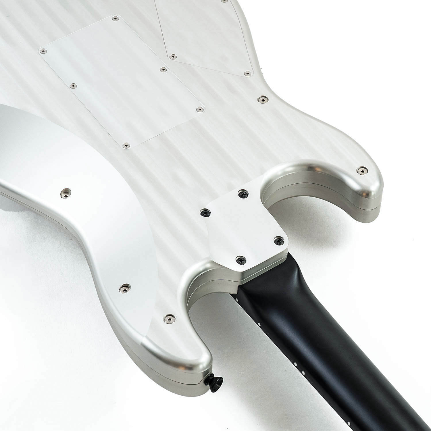 一般的にアルミニウムをボディに使用するギター/ベースは、フレーム構造や木工では実現不可能な独創的なデザインを採用しています。Alumìnioは、オーソドックスなスタイルながらもアルミニウムボディのギター/ベースを追求し、即戦力として使える楽器を目指しています。