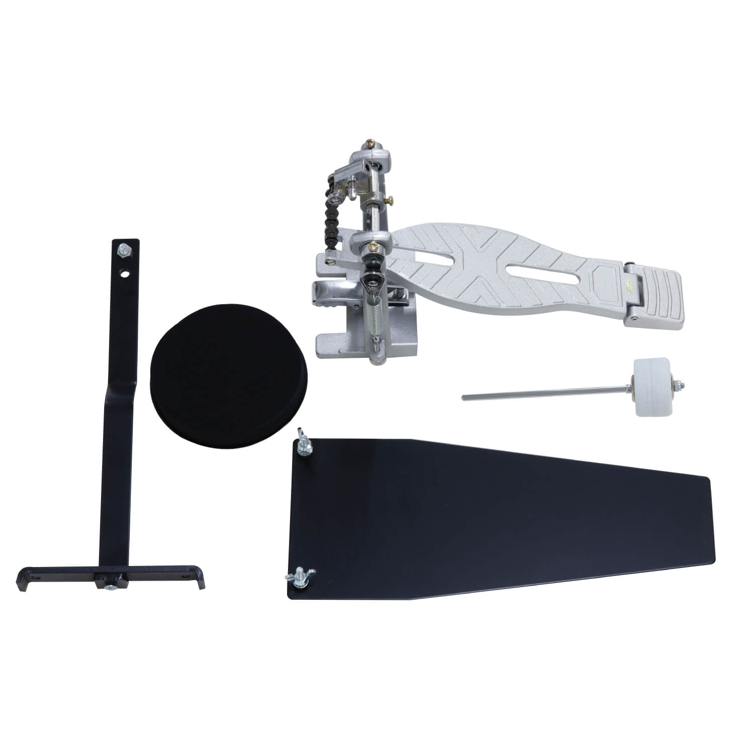 バスドラム練習用のパッドとペダルのセットです。頑丈で本格的なペダルで、実物に近い操作感と長く使える耐久性をプラスしました。しっかりとした支柱とパッドでハードな練習にも耐えられる構造です。パッドの取付方法は実物のバスドラムペダルの取付方法に近い方法。底面に面ファスナーを取り付けることで、カーペットやドラムマット等の上で滑りにくい工夫がされています。