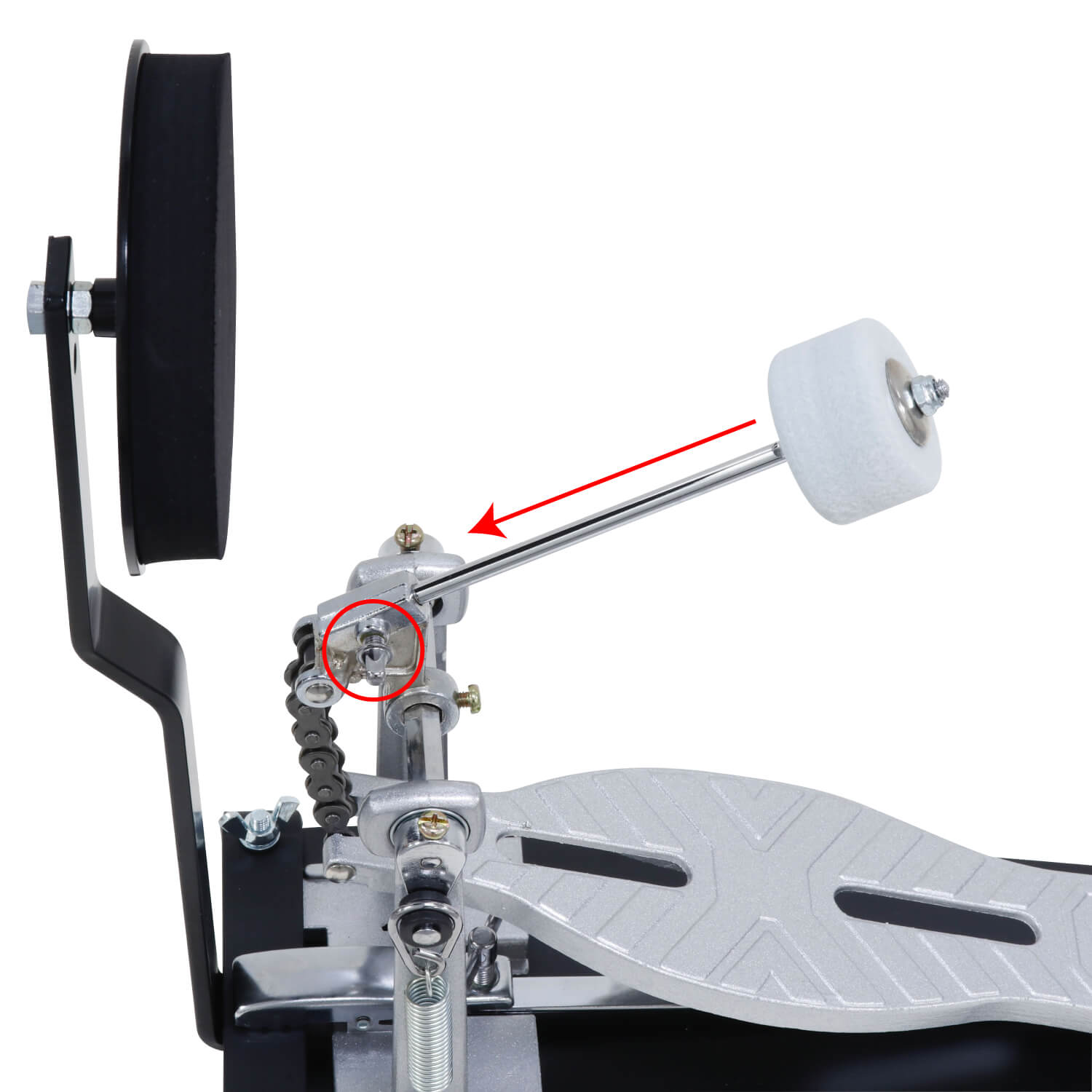 ⑧パッドの中心にビーターが来るように長さを調整し、チューニングキー(付属しておりません)を使用してしっかりと固定すれば完成です。