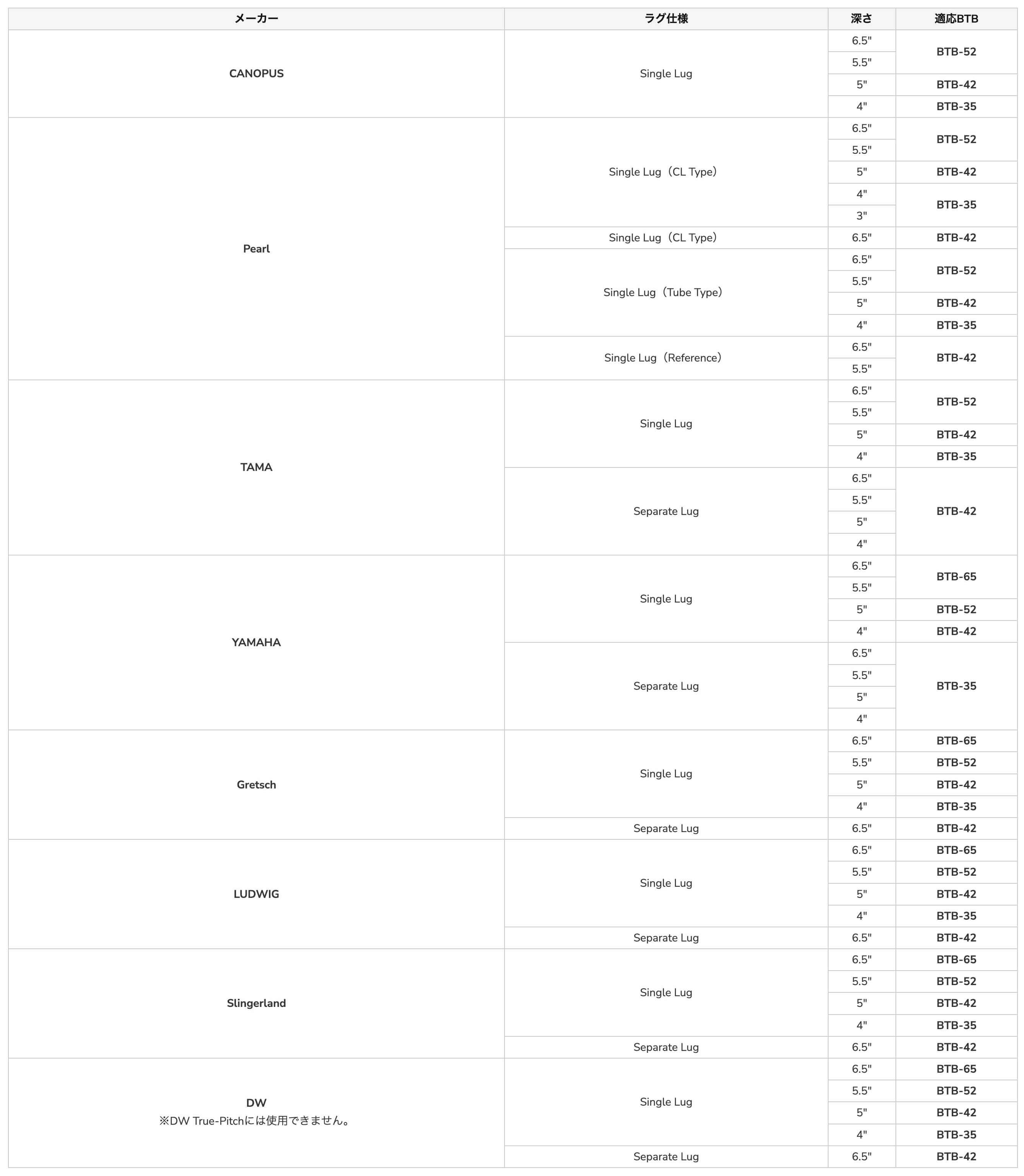 BTB各社スネア適応表