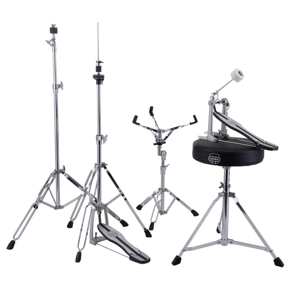 頑丈で安定感あるスタンド類(シンバルスタンド x1、ハイハットスタンド x1、スネアスタンド x1、ドラムスローン/椅子 x1)が付属します。