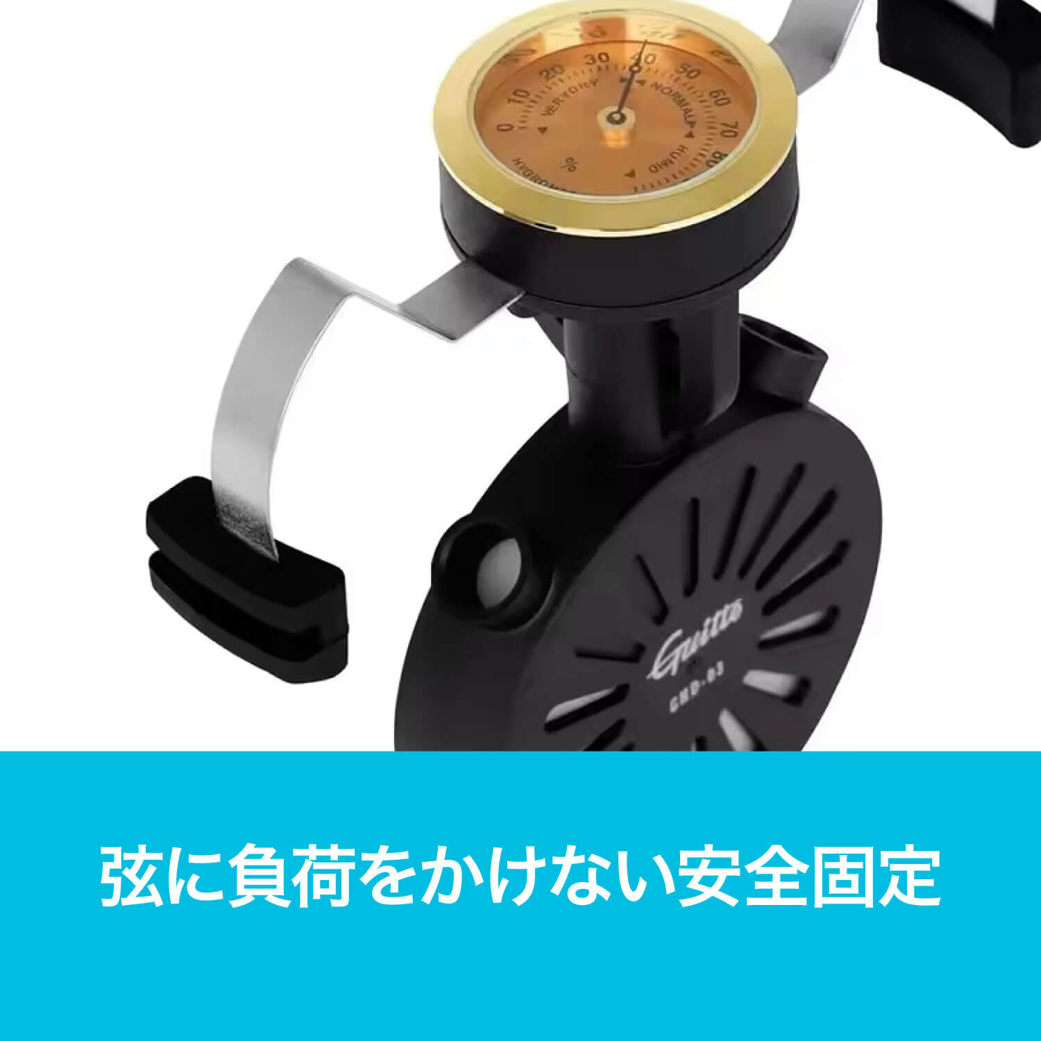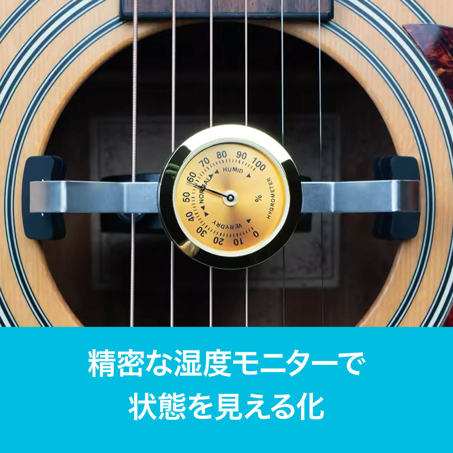 Guitto GHD-03は、アコースティック/クラシックギター向けのサウンドホール取付け型加湿器です。加湿ユニットと針式湿度計を一体化し、電池不要でギター内部の湿度を確認しながら均一にうるおします。サウンドホール縁をバネ式クリップで固定する独自構造により、弦に負荷を掛けて吊るすタイプと異なり、ネックへ余計な張力を与えません。柔らかなゴムグリップが接触部を保護し、取り付け・取り外しや給水も簡単です。