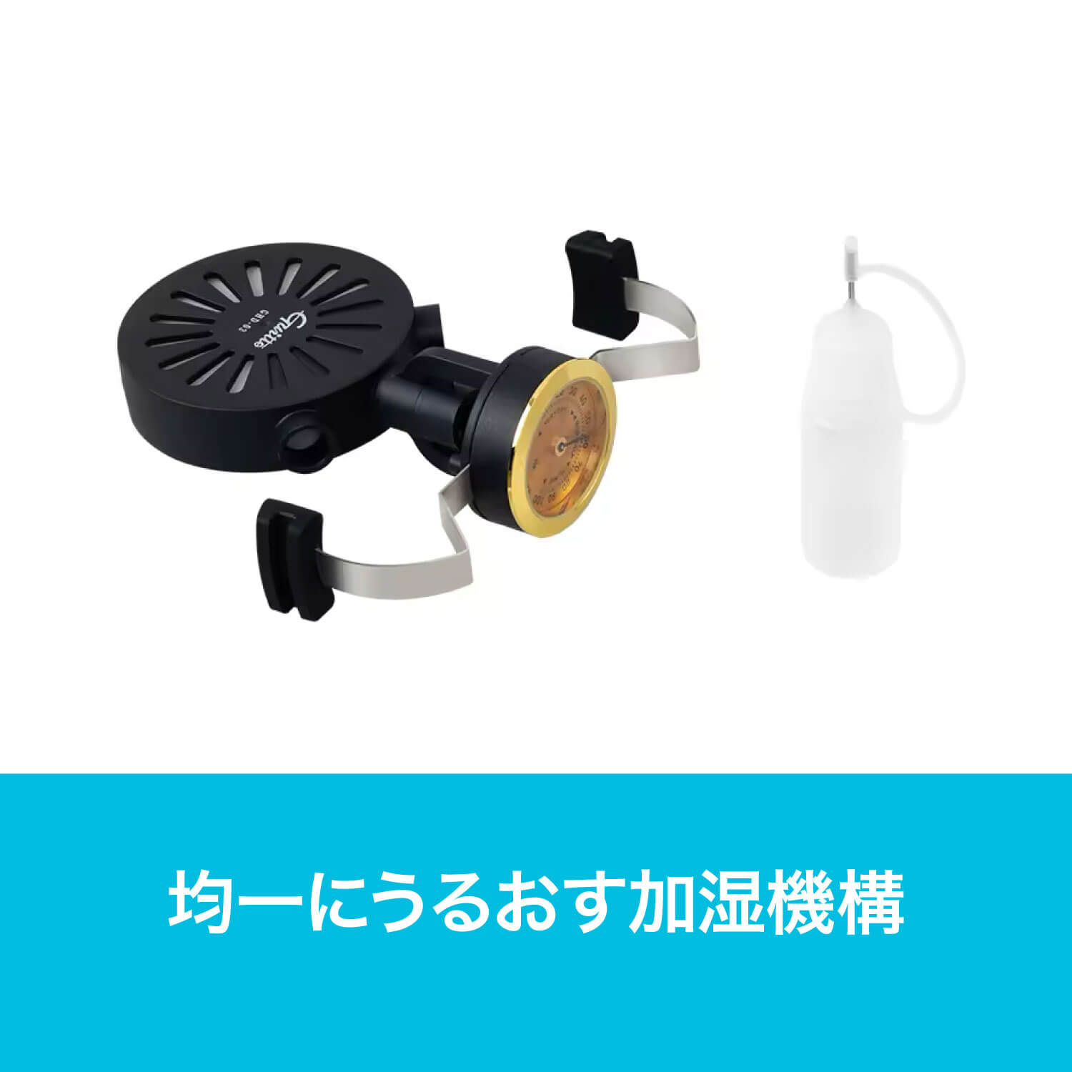 本体前面にアナログ針式の湿度計を内蔵。ケースを開けた瞬間に現在の湿度を読み取れます。室内とボディ内部の差にも気づきやすく、乾燥期の加湿量アップや梅雨時の控えめ運用など、季節に合わせた管理がしやすくなります。電源を使わないため、電池切れの心配がなく長く使えます。