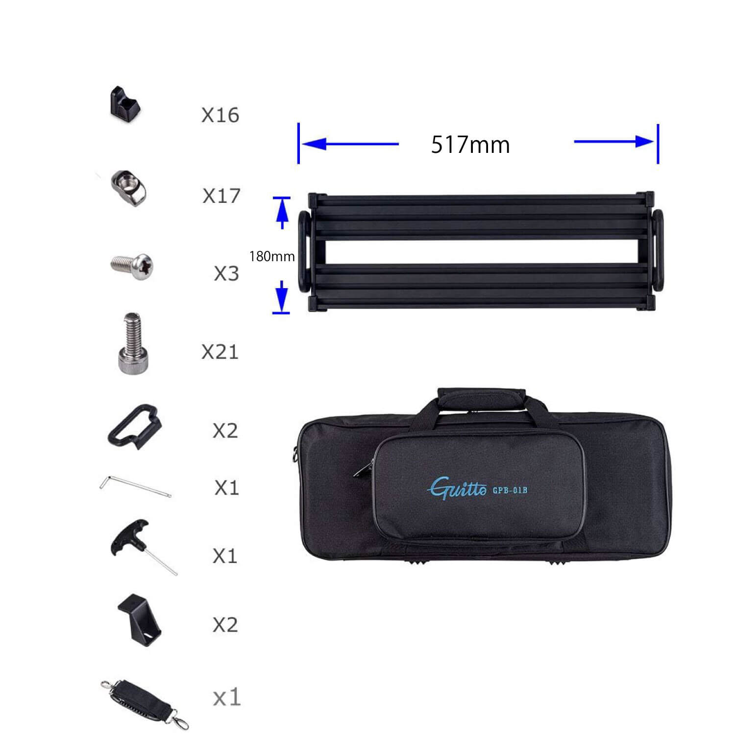 GPB-01は、軽量かつ強靭なアルミ合金フレームに折りたたみ式アンダーシャーシを備えたペダルボードです。付属の固定ブロックを使う独自の固定方式で、面ファスナーに頼らず素早く確実にレイアウト可能。表面はアルマイト処理、外周はエッジ保護設計で傷に強く、過酷な踏み込みにも対応します。電源はボード下に収納でき、省スペースで持ち運びも容易です。