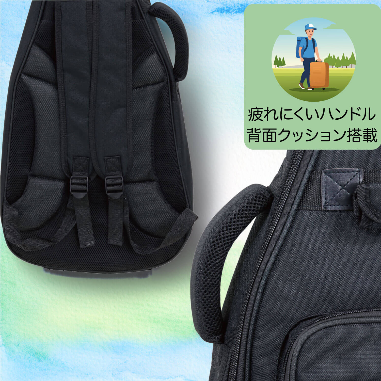 掴みやすく疲れにくいハンドル、背面にメッシュ生地の快適なクッション搭載!