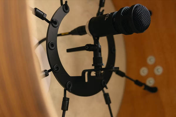 コンパクトな本体サイズにより、Kick Micはバスドラムのポートホールからの設置はもちろん、内部マウントにも対応します。180°以上の角度調整が可能なスイベルマウントと、位置を自在に変えられるハンドル構造により、限られたスペースでもすっきりとしたセッティングが行えます。※ロッキング・スイベルマウントは付属しません。