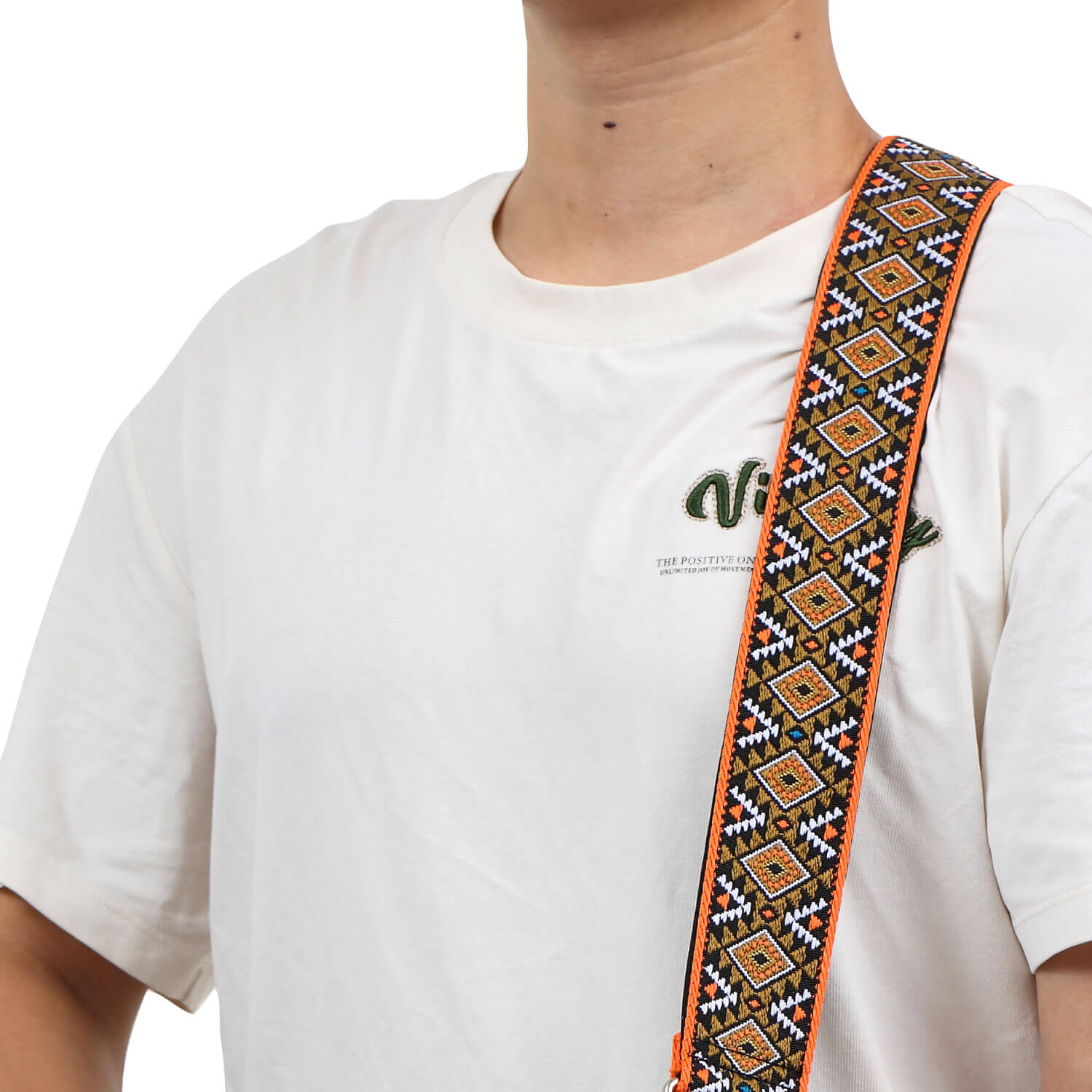 KSTR-318ギターストラップは、耐久性とスタイルを兼ね備え、あらゆるギターとファッションにマッチするデザインです。エスニックなジャガード生地を採用し、それにナイロン生地を組み合わせることで、見た目の美しさと実用性を高めています。滑りにくい設計でありながら、適度な滑りも可能で、自然と最適な演奏ポジションを保つことができます。