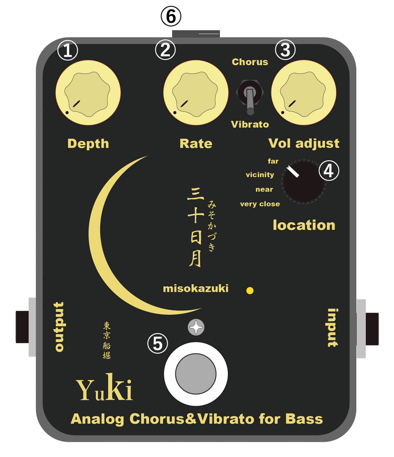 ベースに最適化されたサウンドを追求したコーラス&ヴィブラート「三十日月(misokazuki)」。筐体の大きさや内部の深さがサウンドに大きく影響するという考えのもと、本機では他の bass sound system シリーズ同様、やや深めの筐体を採用しました。アナログ音声遅延IC(BBD素子)による温かみのあるナチュラルな揺れに加え、やや中域を抑えたサウンドキャラクターを狙って、インプットバッファーにはFETを採用。ベースに心地よくなじむ、奥行きのあるモジュレーションが得られます。トグルスイッチにより Chorus / Vibrato の切り替えが可能で、楽曲やプレイスタイルに応じた使い分けにも対応。さらに Vol adjust により、エフェクト音の音量を細かく調整できます(このVolは最小まで絞ってもゼロにはなりません)。