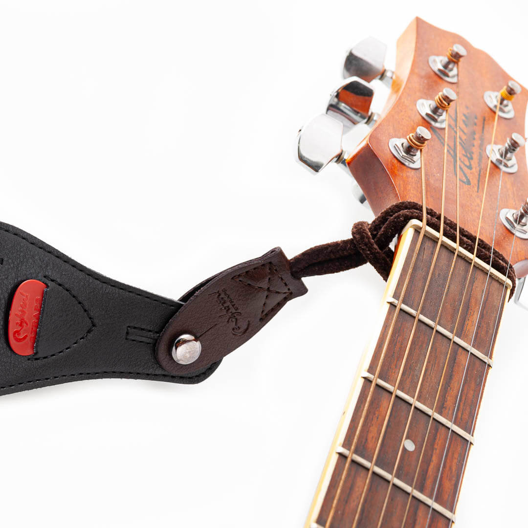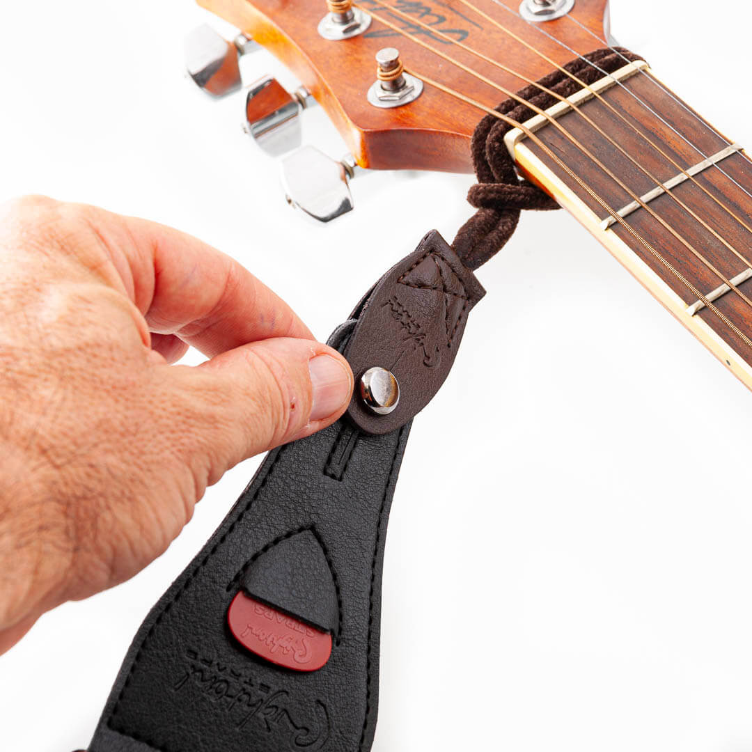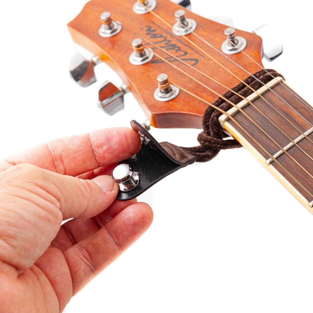 前側やヒール部にストラップピンがない楽器に最適。合成素材を採用し、さまざまなヘッド形状に対応します。また、あらゆるタイプのストラップで使用可能です。指板付近にボタンやネジがないギターのために特別に設計されており、弦の下にしっかり収まり、取り付けも非常に簡単です。
