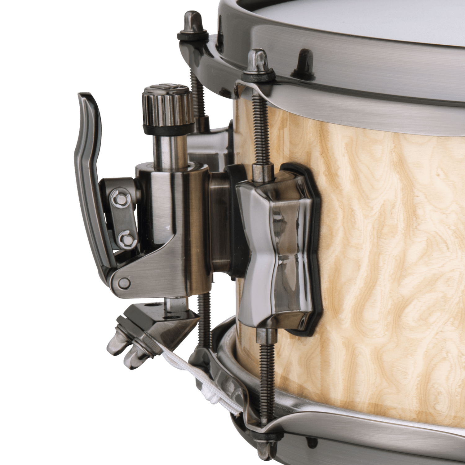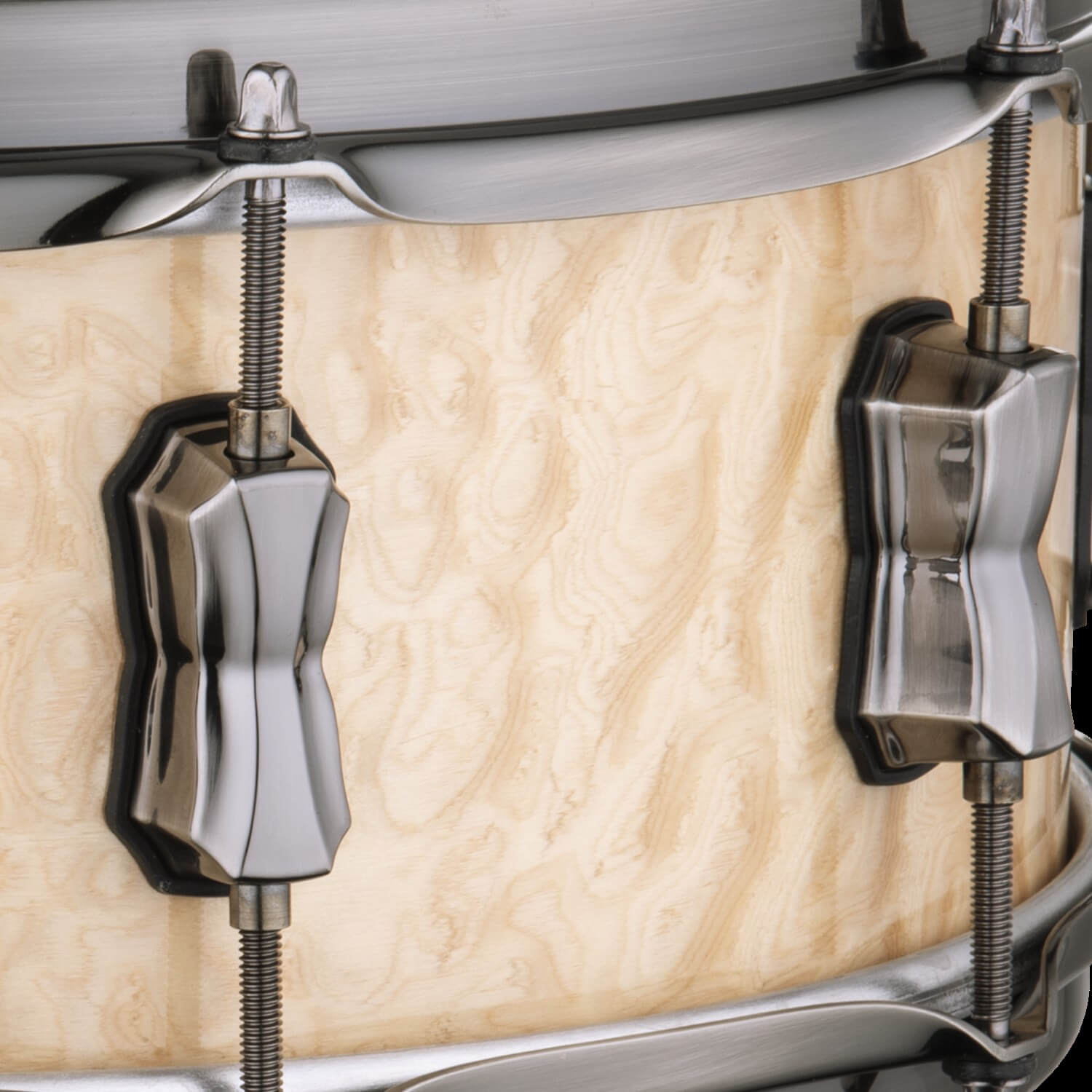 明るさと深みのバランスの良さに定評があるメイプルとウォルナットのハイブリッドシェルを、あえて薄く仕上げることにより深みとダークな彩りある響きを加えました。ギリシャ神話伝説の“ペガサス”が如く、地に足の着いたかのような安定感と一打で空を駆けるような華やかなアタック感。その二面性こそがこのスネアの真骨頂です。美しい杢目を持ったナチュラルに仕上げられたメイプルバールのフィニッシュが、その魅力をさらに神秘的に引き立てています。