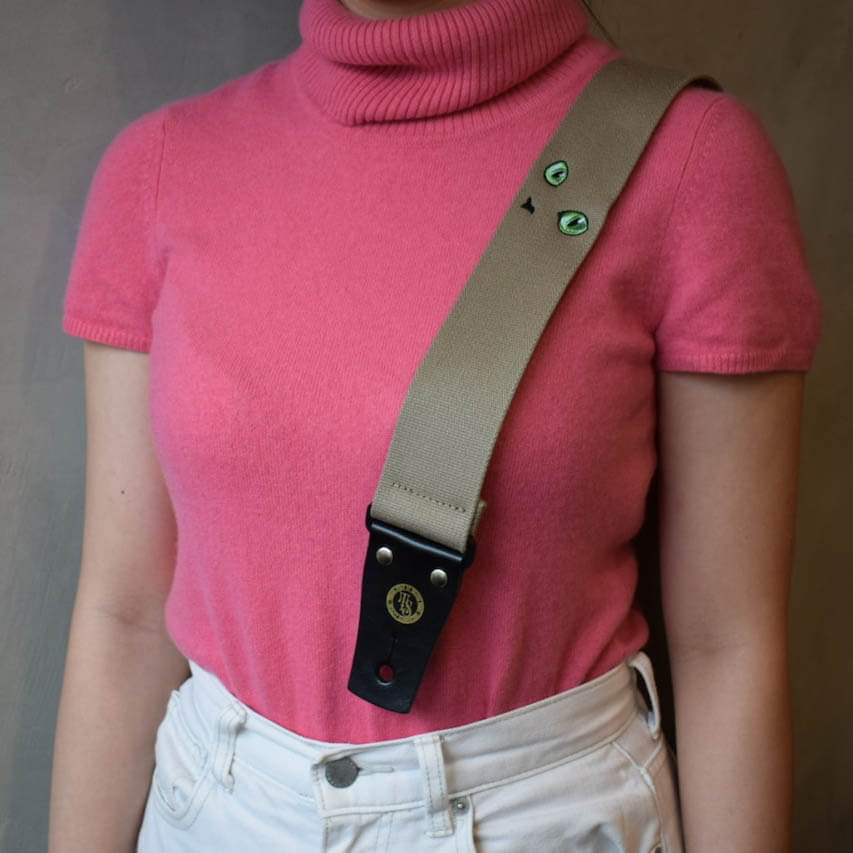 本体に柔らかくて肩への馴染みの良いアクリル製のベルトを使用したストラップです。