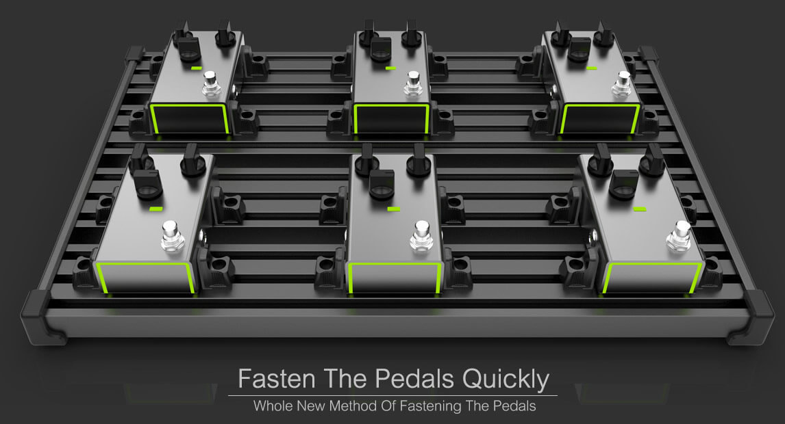 Guitto GPB Series は、軽量かつ強靭なアルミ合金フレームに折りたたみ式アンダーシャーシを備えたペダルボードです。付属の固定ブロックを使う独自の固定方式で、面ファスナーに頼らず素早く確実にレイアウト可能。表面はアルマイト処理、外周はエッジ保護設計で傷に強く、過酷な踏み込みにも対応します。電源はボード下に収納でき、省スペースで持ち運びも容易です。
