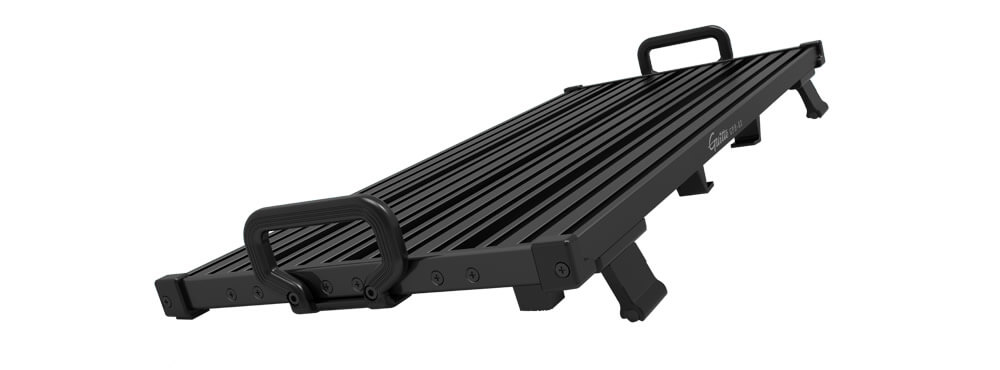 ボード下に電源を収められるため、天面のスペースを最大限に活用できます。電源やケーブルが視界に入らず、踏み間違いを減らし、見た目もすっきり。折りたたみ機構により、使用時は十分な剛性を確保しつつ、撤収時は薄く畳んで省スペースで持ち運べます。対応電源の目安は高さ35mm・幅60mm・長さ145mm以下で、多くの小型パワーサプライに適合します。