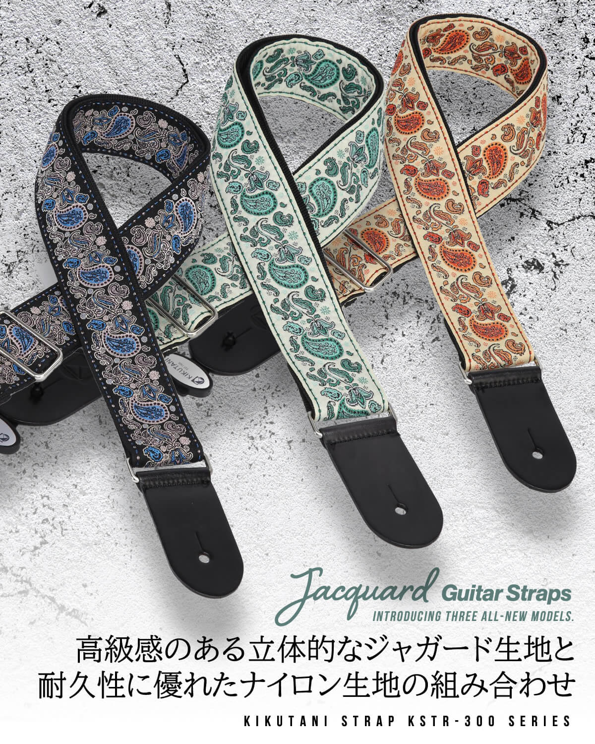 キクタニ KSTR-300シリーズ・ギターストラップは、耐久性とスタイルを兼ね備え、あらゆるギターとファッションにマッチするデザインです。エスニックなジャガード生地を採用し、それにナイロン生地を組み合わせることで、見た目の美しさと実用性を高めています。滑りにくい設計でありながら、適度な滑りも可能で、自然と最適な演奏ポジションを保つことができます。