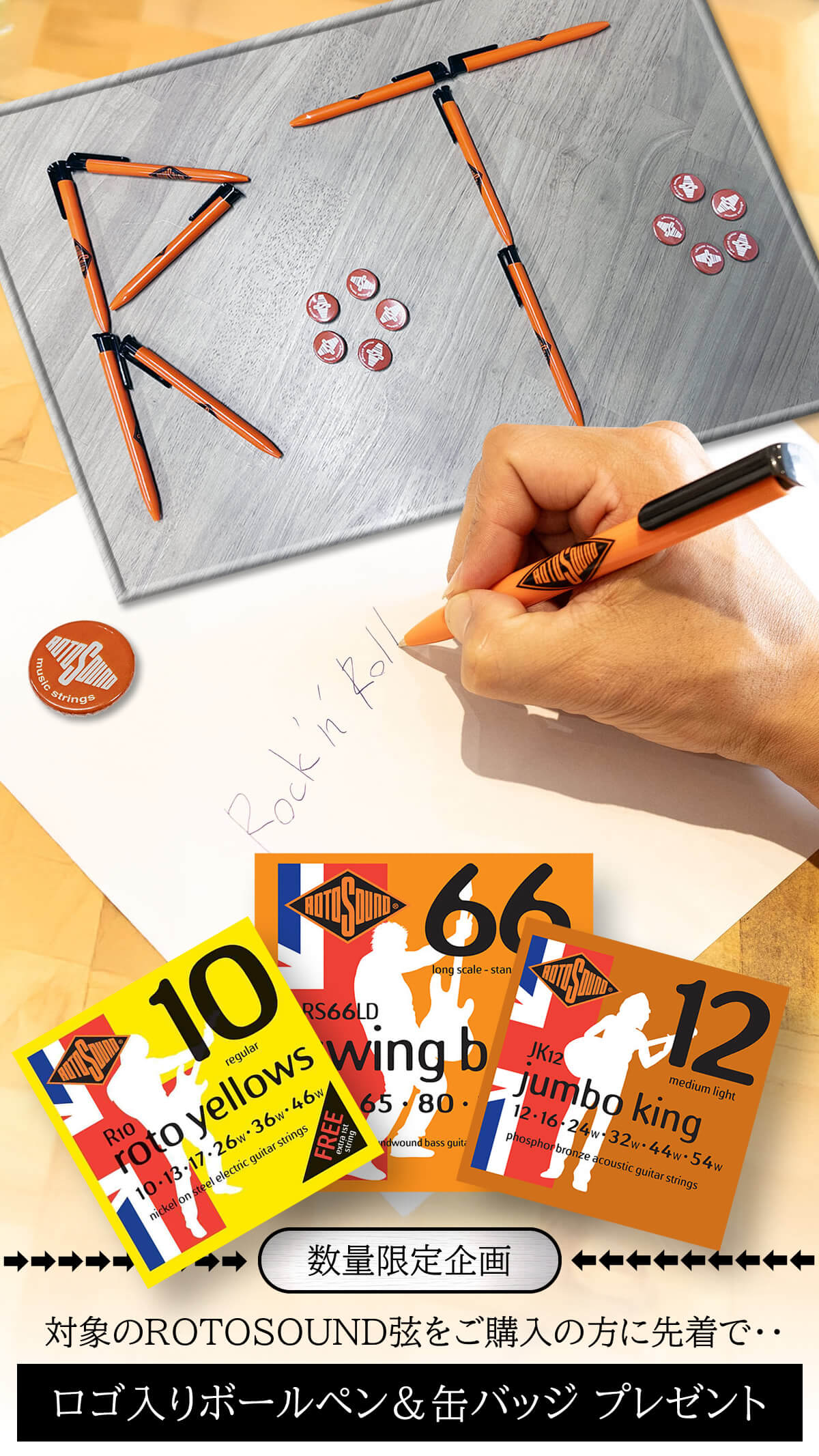 12月1日(月)よりキャンペーン実施店舗にて、ROTOSOUND エレキギター弦、エレキベース弦、アコースティックギター弦をご購入の方に、先着で“ロゴ入りボールペン&缶バッジ”をプレゼントします。