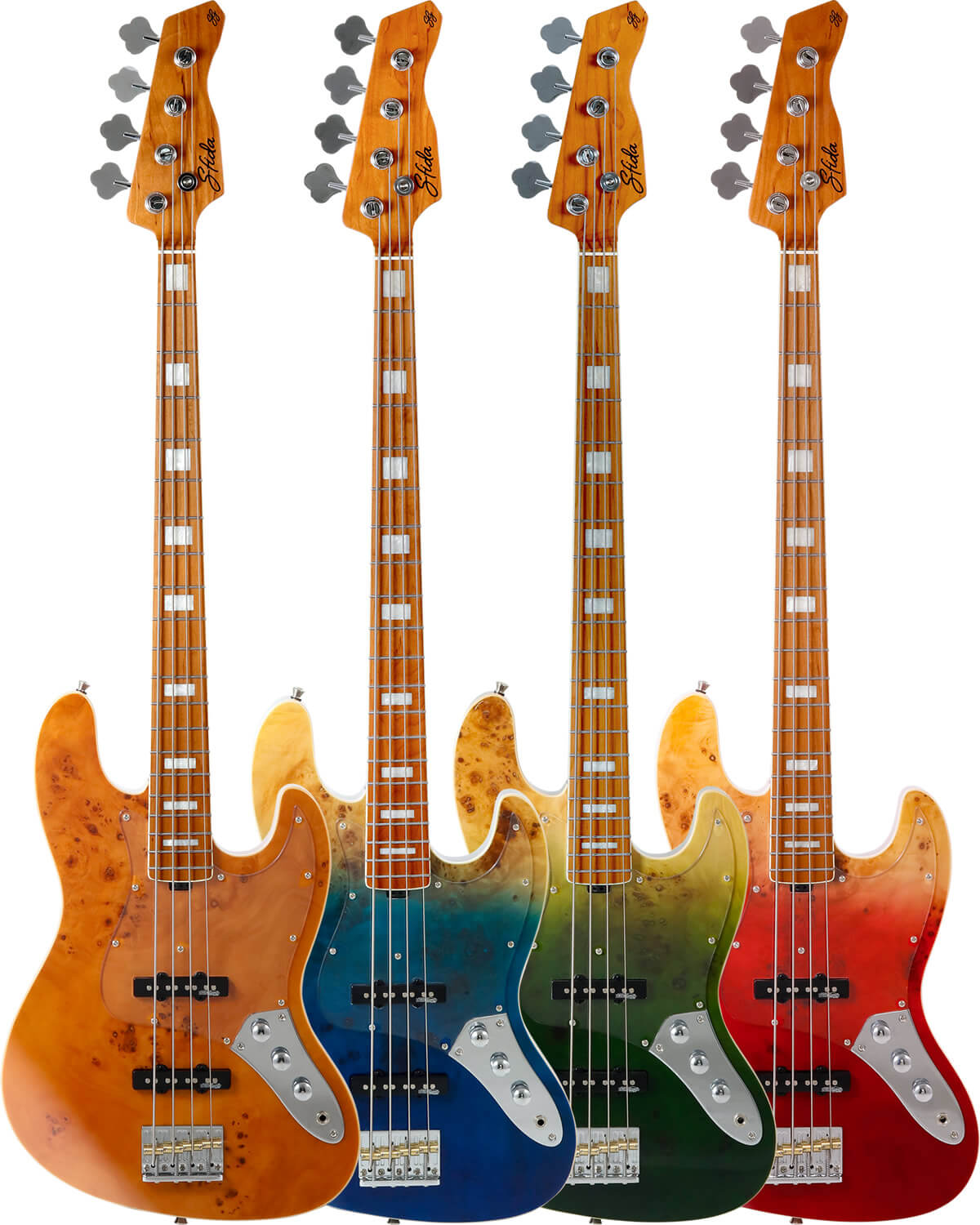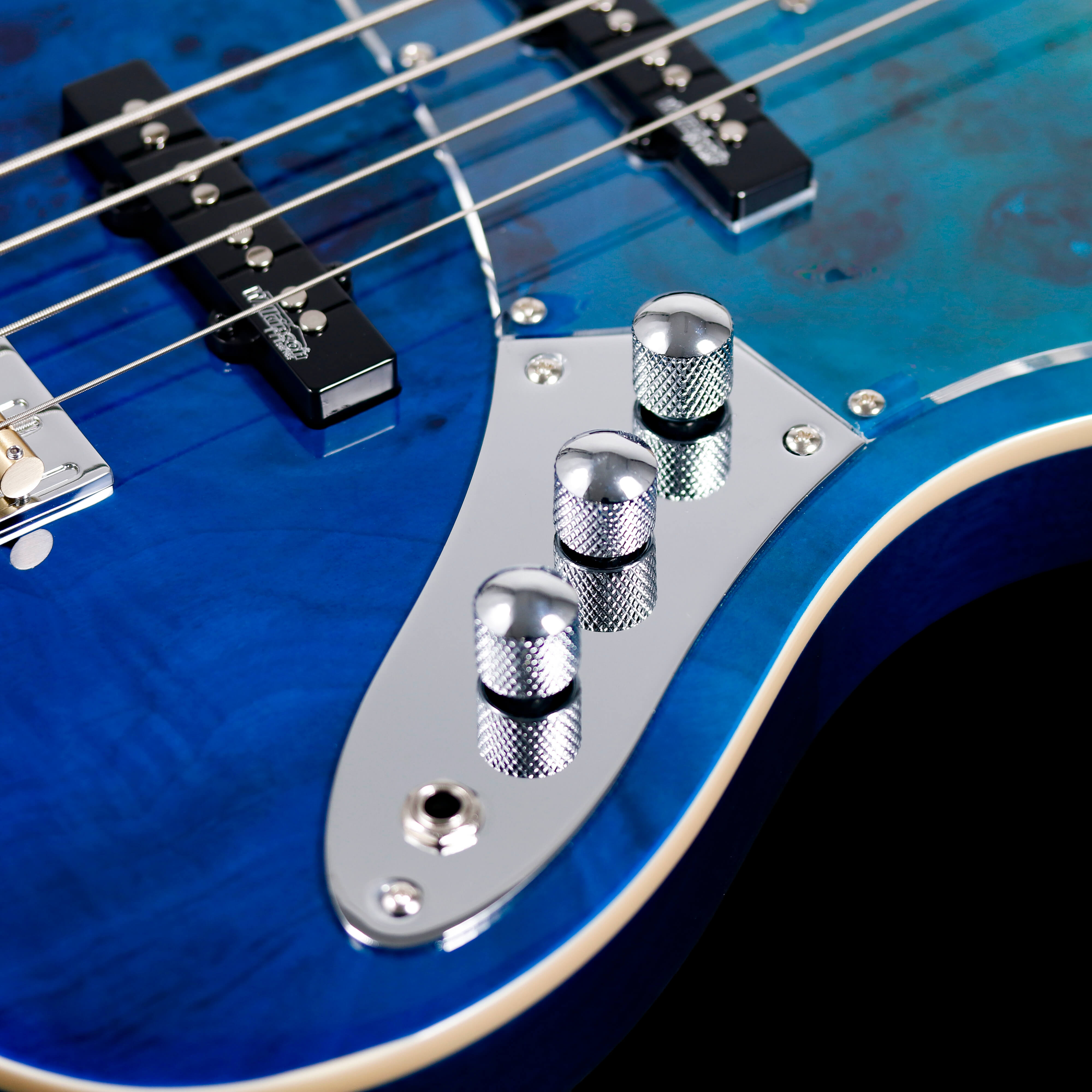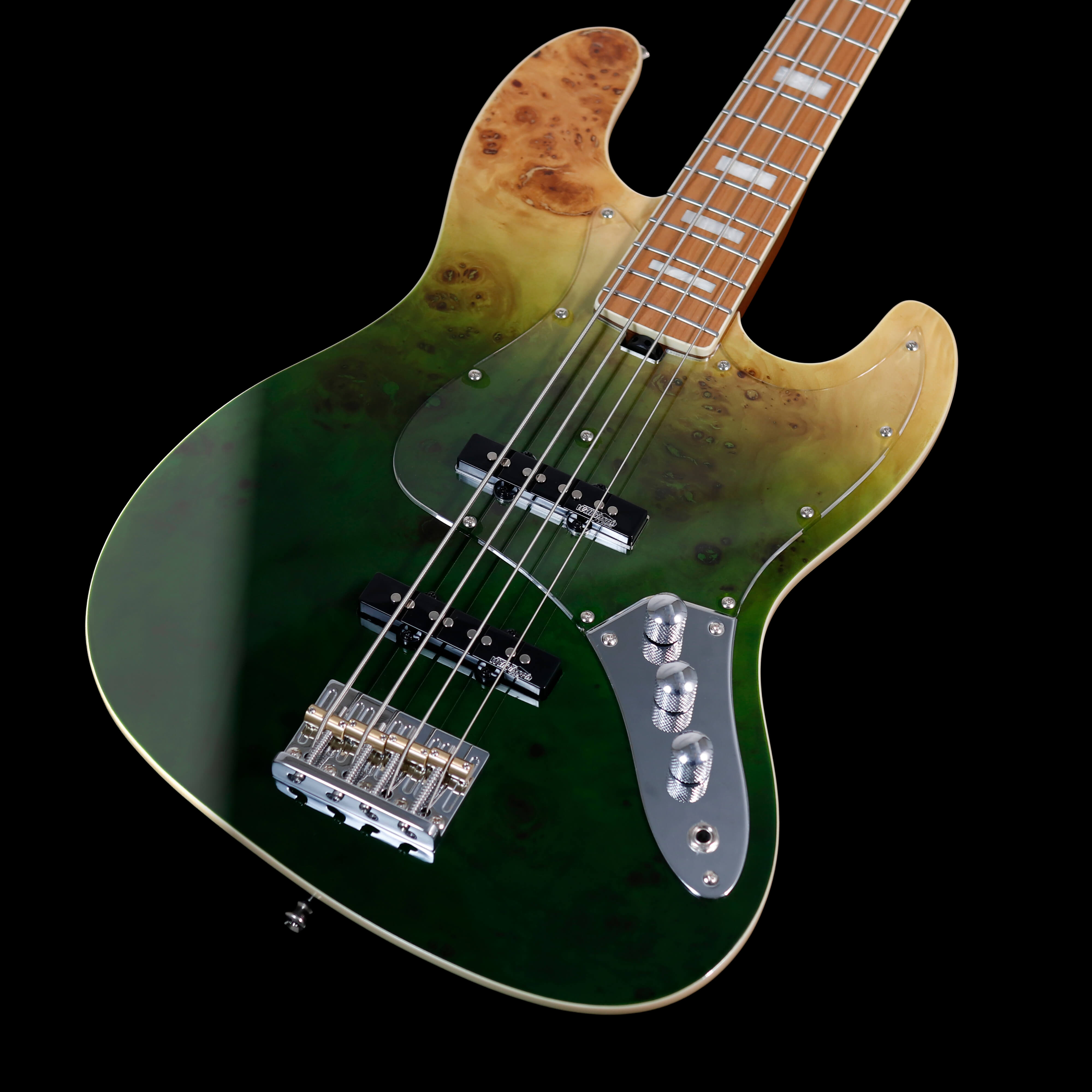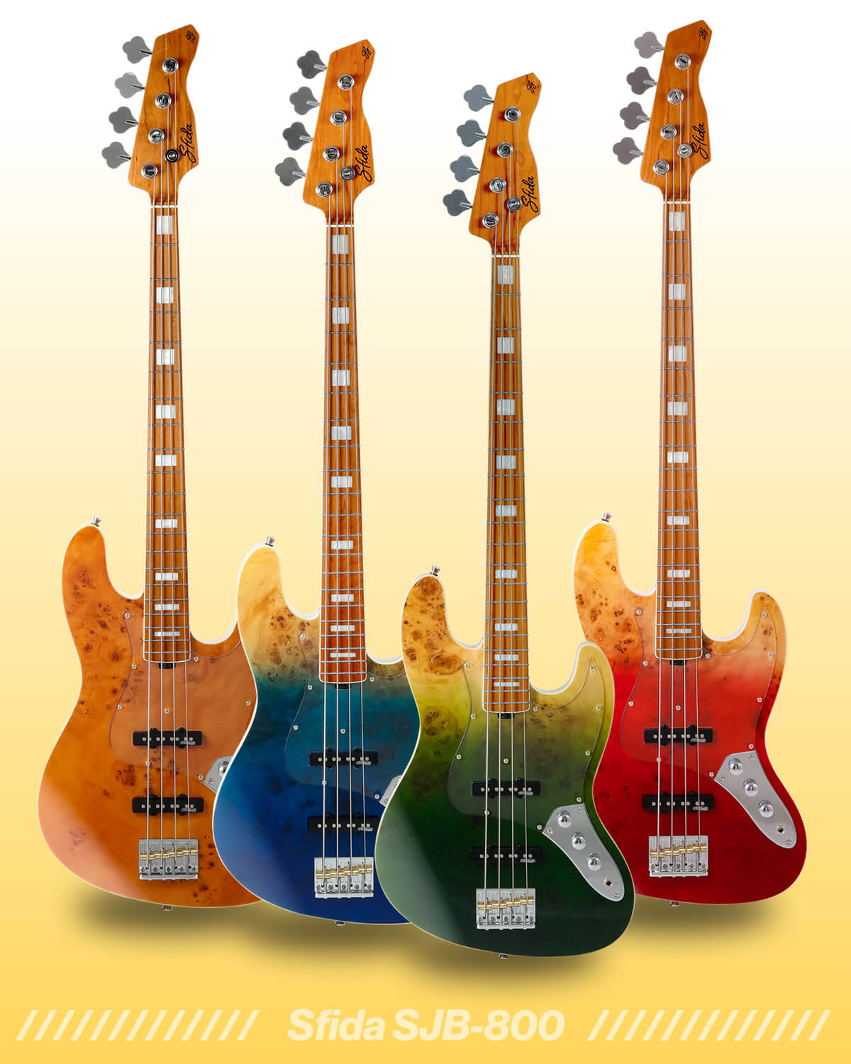 バールポプラトップを採用したJBスタイル「SJB-800」は、美しい木目を引き立てるカラーリングに加え、ローステッド・メイプルネックやネックバインディング、ブロックポジションマークによる高級感あふれるルックスが特長です。