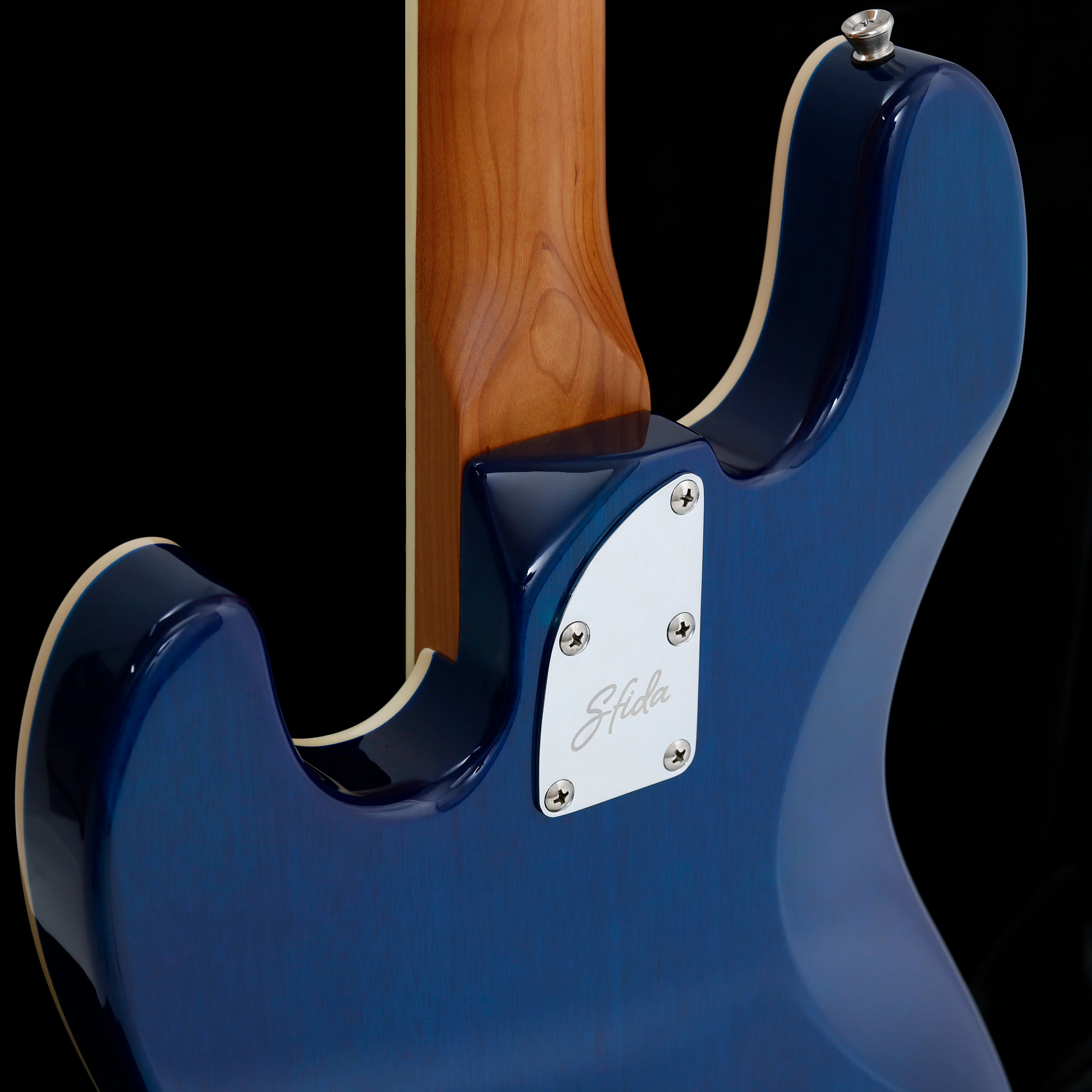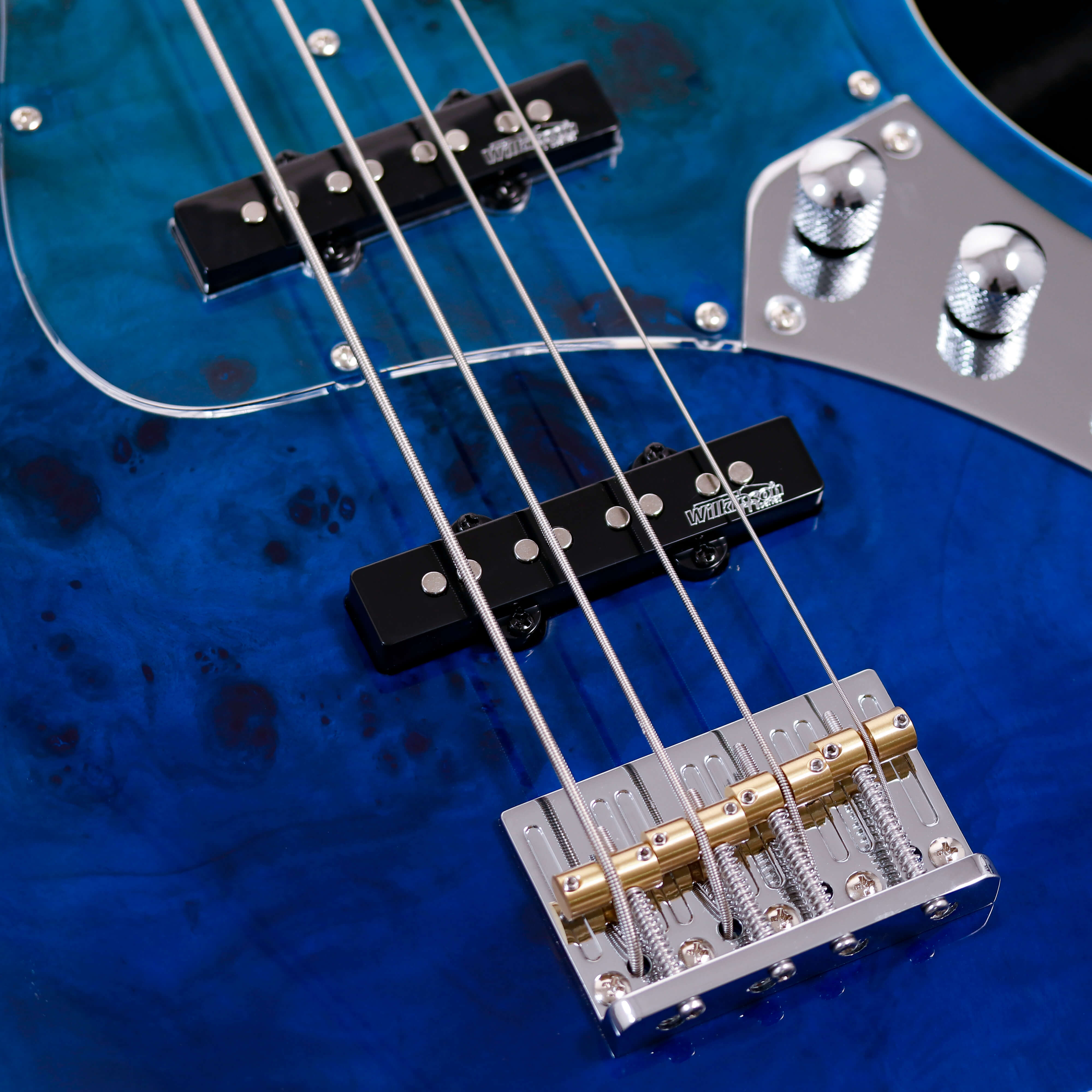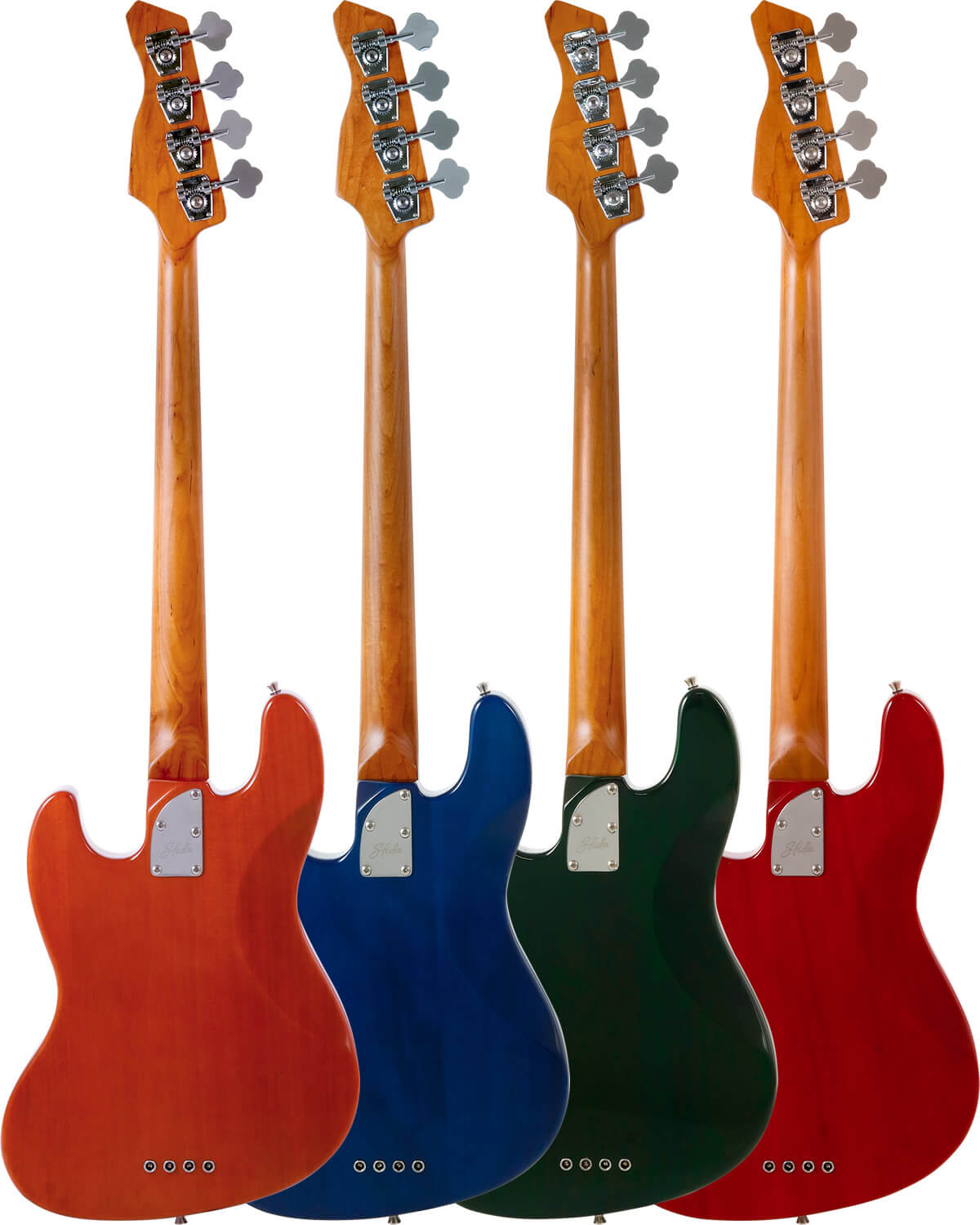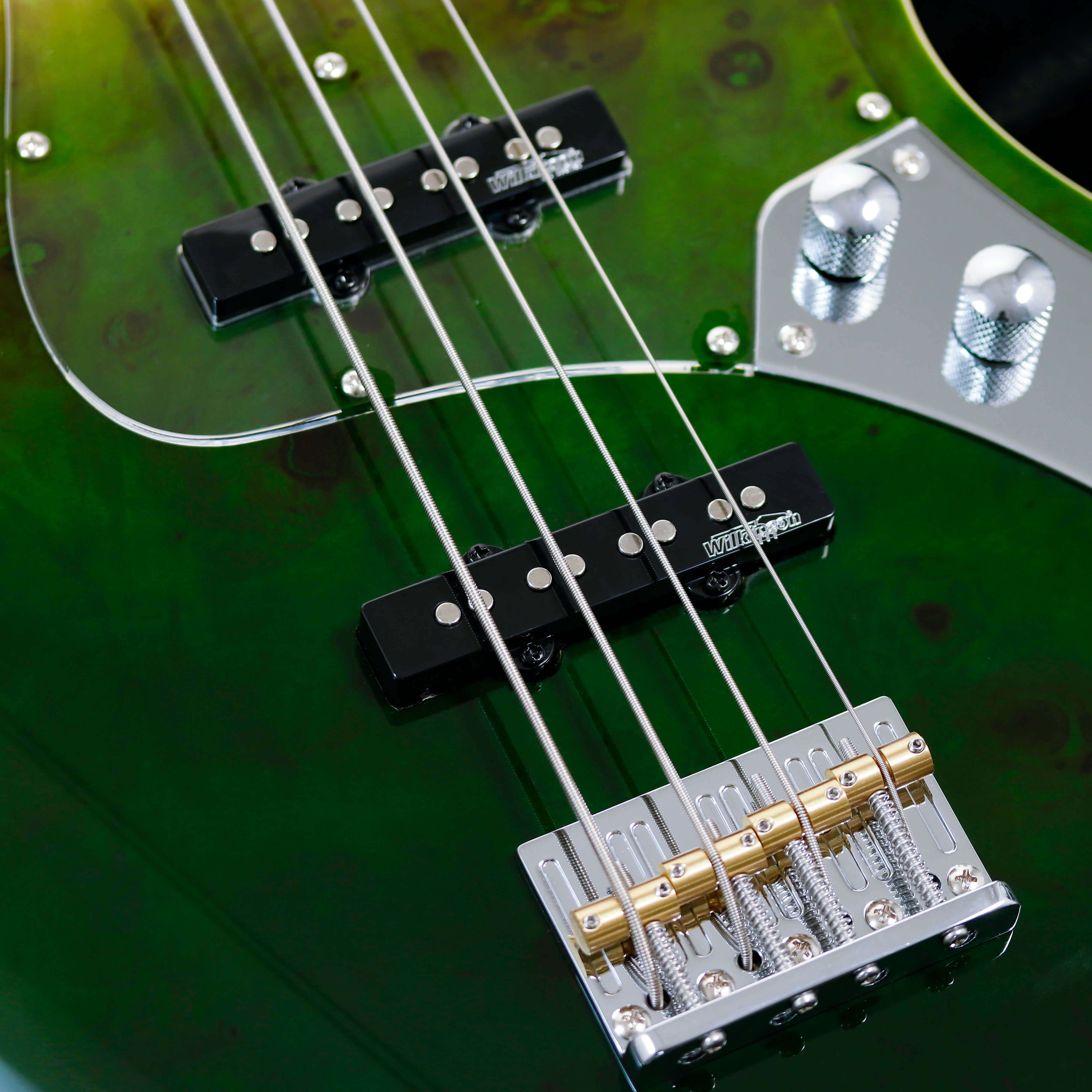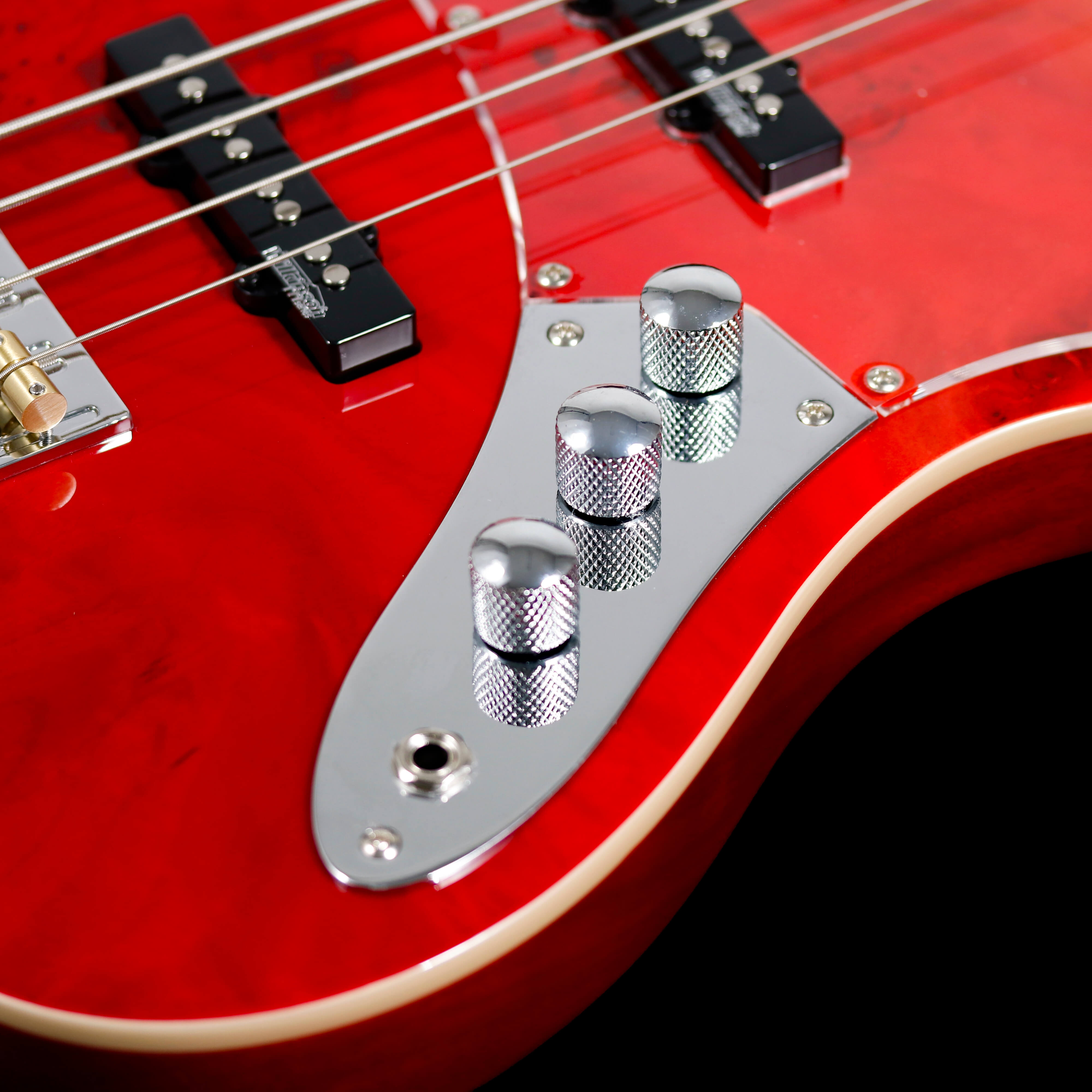 バールポプラトップを採用したJBスタイル「SJB-800」は、美しい木目を引き立てるカラーリングに加え、ローステッド・メイプルネックやネックバインディング、ブロックポジションマークによる高級感あふれるルックスが特長です。
