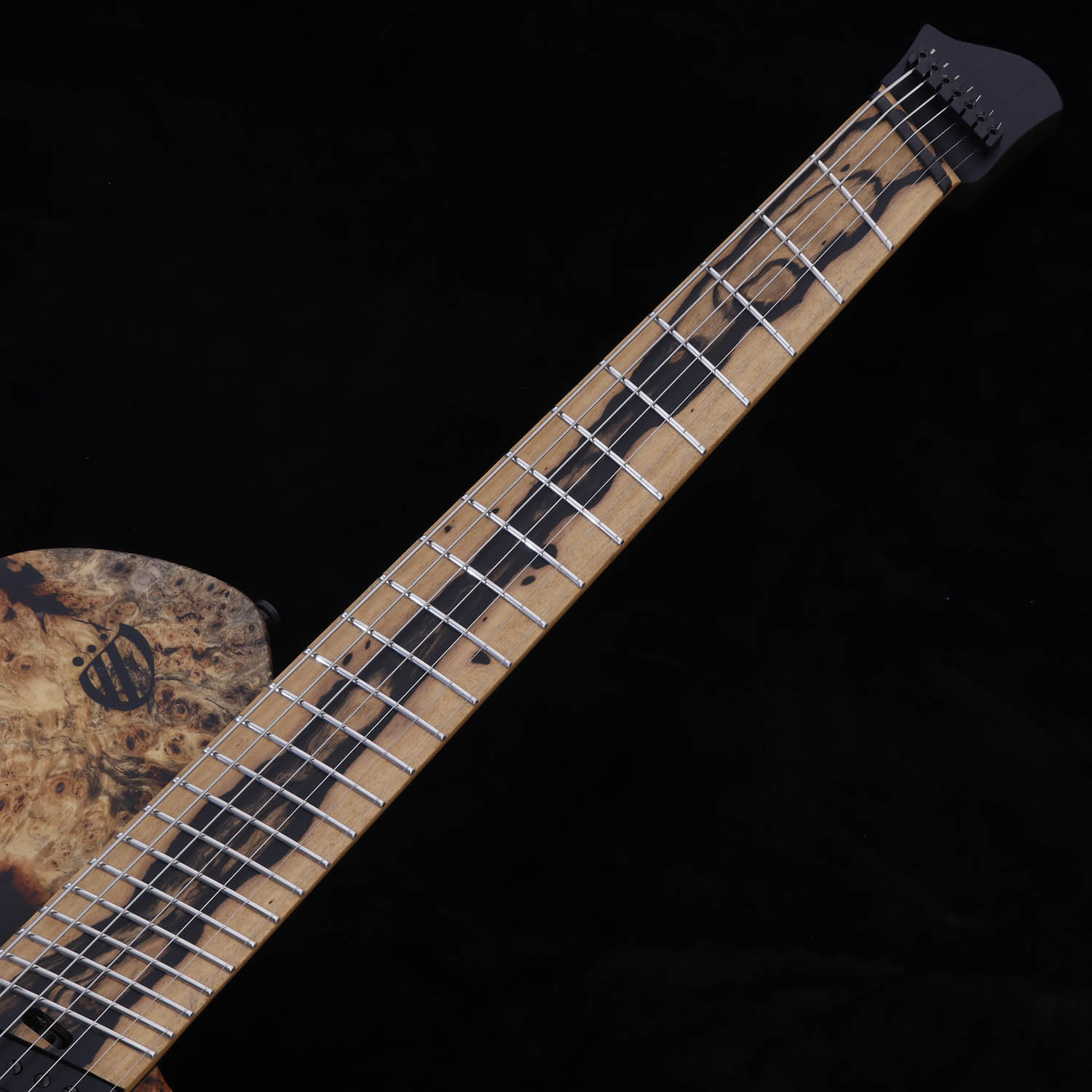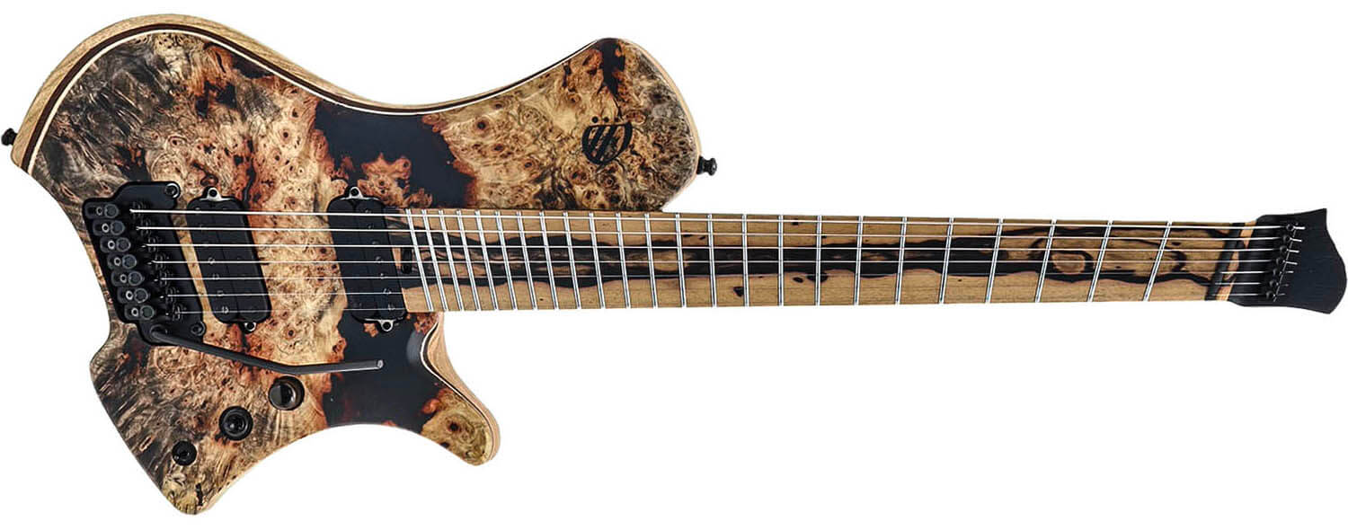 コンパクトなオリジナルシェイプのボディは、バックアイ・バールトップとアッシュの組み合わせ。指板には、ブラック&ホワイト・エボニーとも呼ばれる”ペールムーンエボニー”を採用し、エキゾチックな雰囲気を漂わせています。ネックは、ウェンジとメイプルを組み合わせた5ピース構造です。